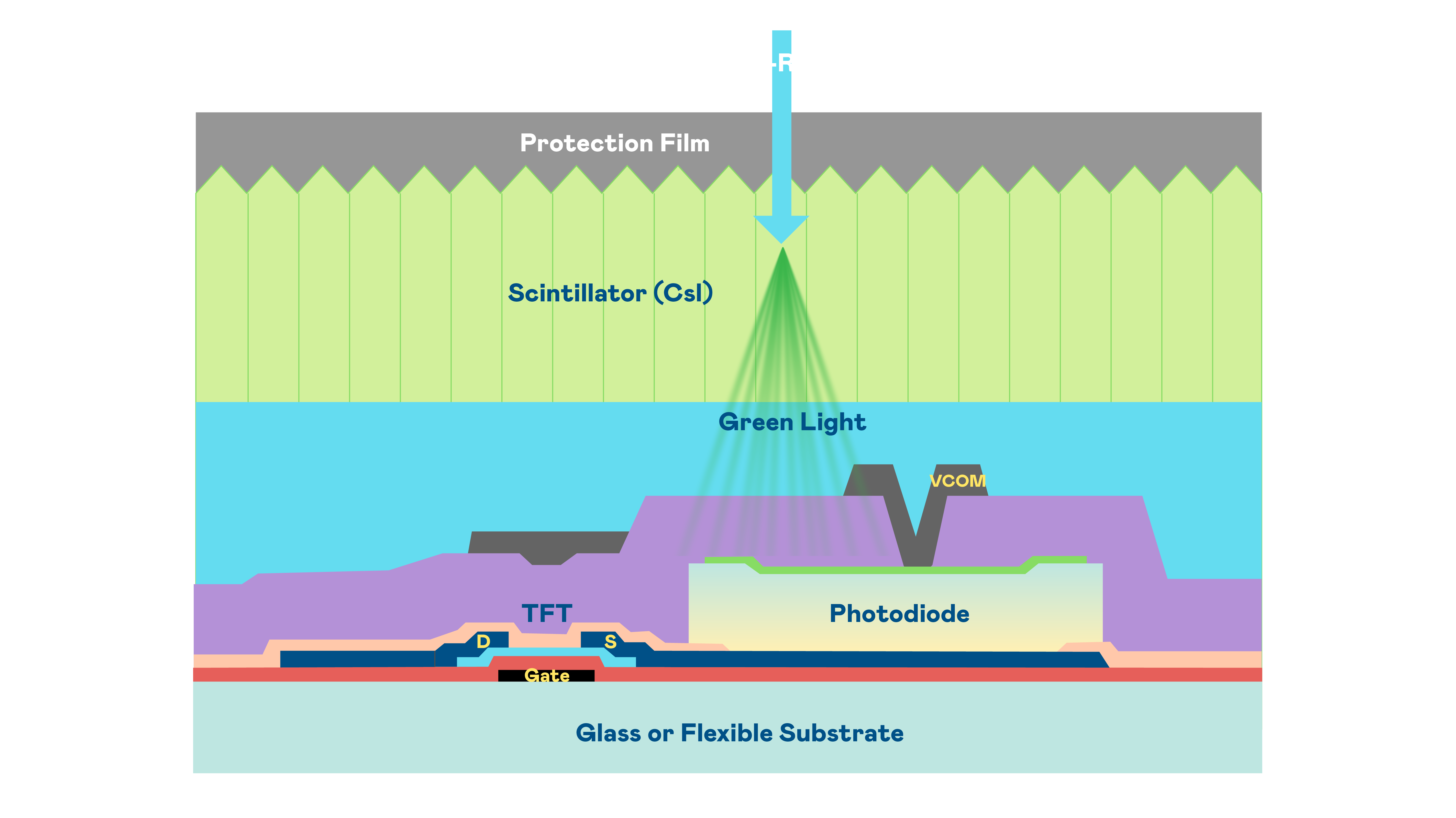 人生就是博的X光影像感测阵列使用薄膜电晶体 (TFT) 作为每个像素的读取开关,搭配光电二极体(Photodiode)的光电转换元件,用以感测X光影像讯号。